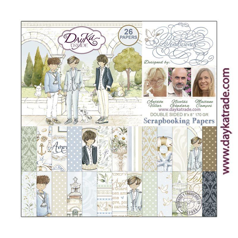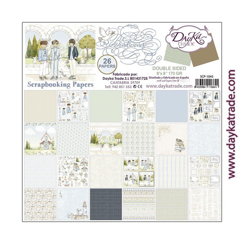10 papeles de 8×8 pulgadas (20×20 cm aprox.), 9 modelos a doble cara + 2 fondos.